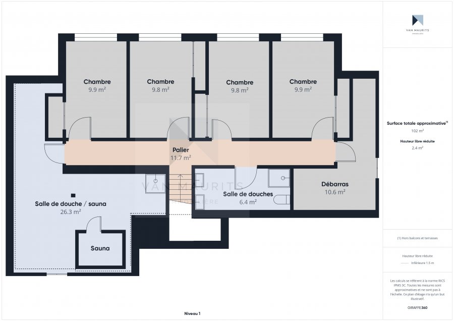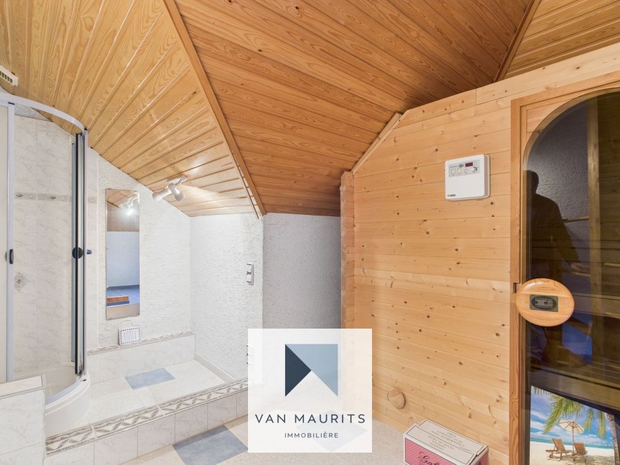 L'étage propose quatre chambres ± 11 m² chacune confortables, une salle de douche et un couloir desservant un espace bien-être unique ± 32 m² : un sauna avec coin détente et douche, idéal pour se relaxer à la maison.